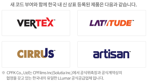 이에 루마필름 한국총판인 CPFK는 유사상품유통과 상표무단 사용을 원천적으로 차단하고자, 루마필름의 제조원인 CPFilms. INC 로 부터 전 세계 루마필름 최초 로 한국시장만을 위한 별도의 제품코드(상품명) 부여받은 4가지 (VERTEX, LATITUDE, CIRRUS, ARTISAN)시리즈를 출시합니다.